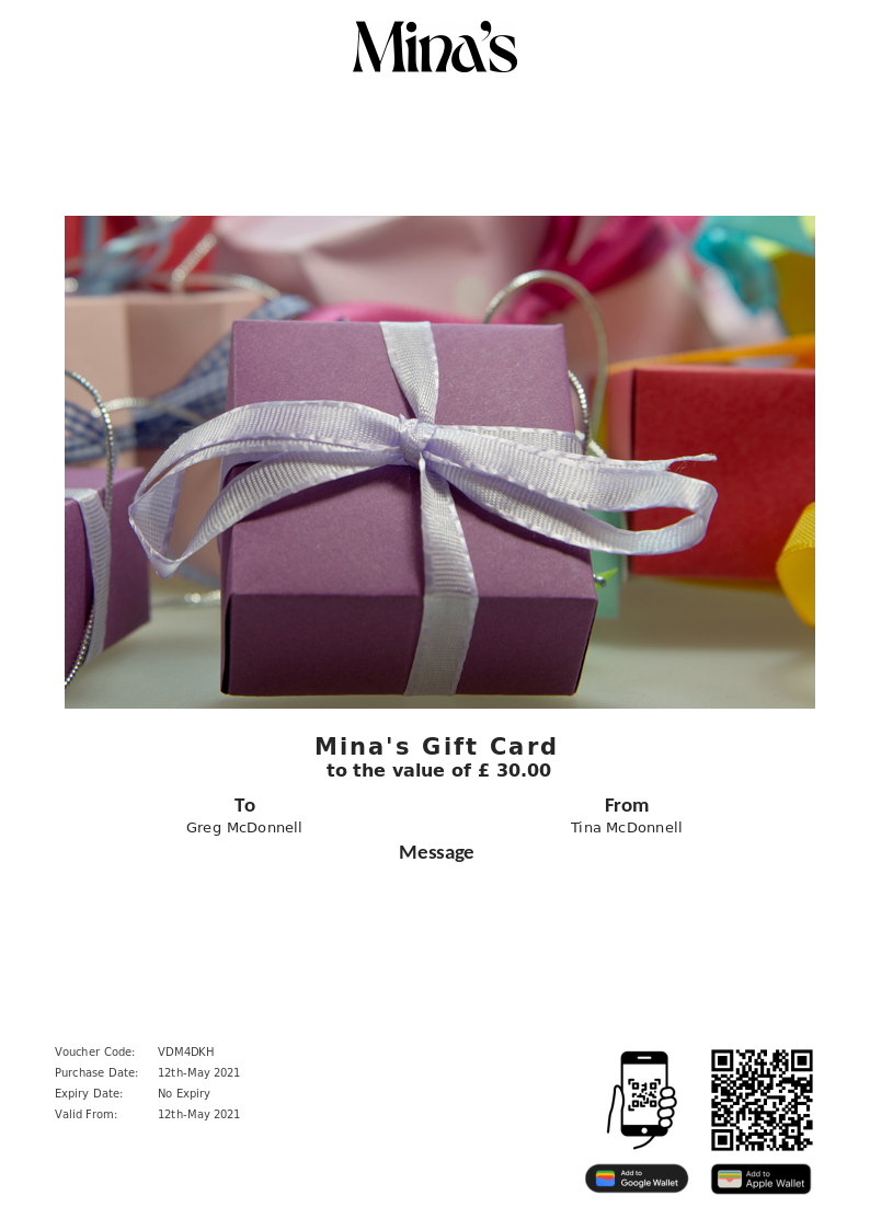 Mina's allows you to purchase instantly printable gift vouchers, special offers and tickets using the Voucher Connect platform.